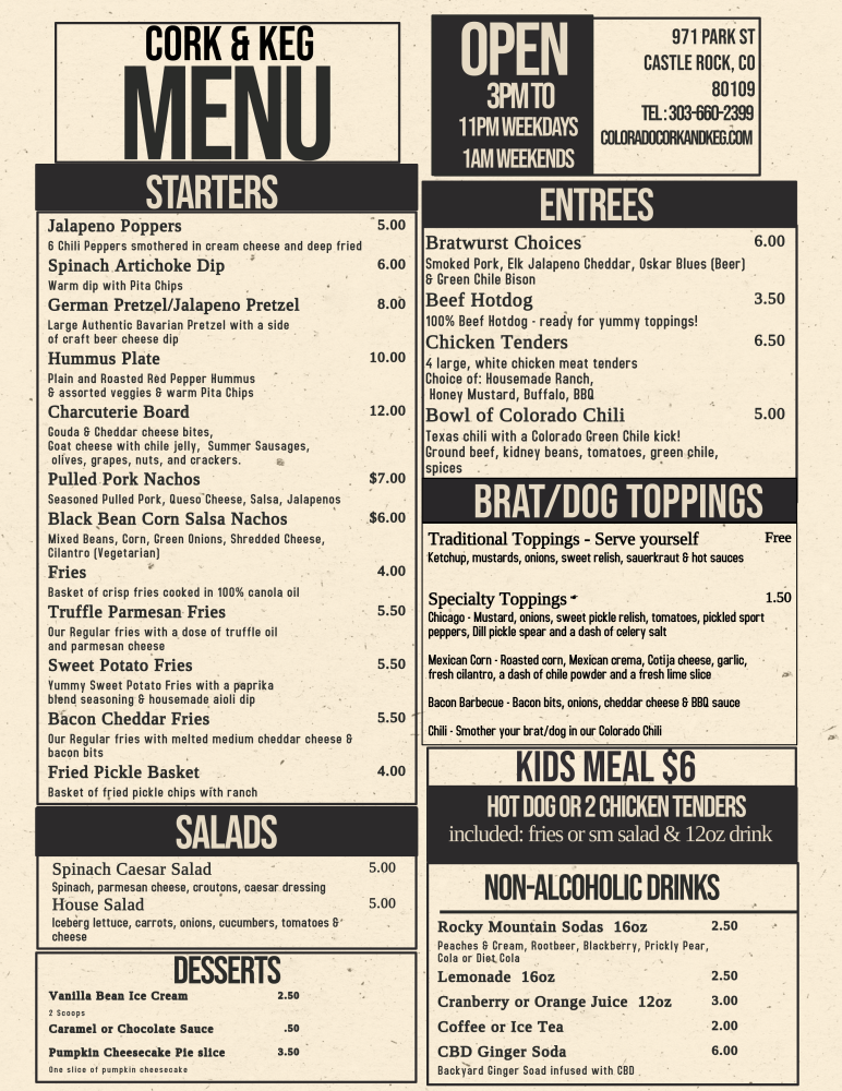 Valerie's Brewhouse is a hot dog haven located at 971 Park St in Castle Rock, CO. With a casual atmosphere and a wide range of amenities, including outdoor seating, pool tables, live music, and more, this spot is perfect for families and friends looking to have a good time. The menu features mouth-watering starters like Giant Jalapeno German Pretzel and Jalapeno Poppers, as well as hearty entrees such as Elk Jalapeno Cheddar Brat and Smoked Pork Brat. Customers rave about the friendly service and great selection of beers and ciders. With unique dishes and a fun environment, Valerie's Brewhouse is a must-visit for anyone in the area.